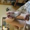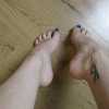 Key sul letto con autoreggenti neri mostra i piedi in pose diverse, smalto blu